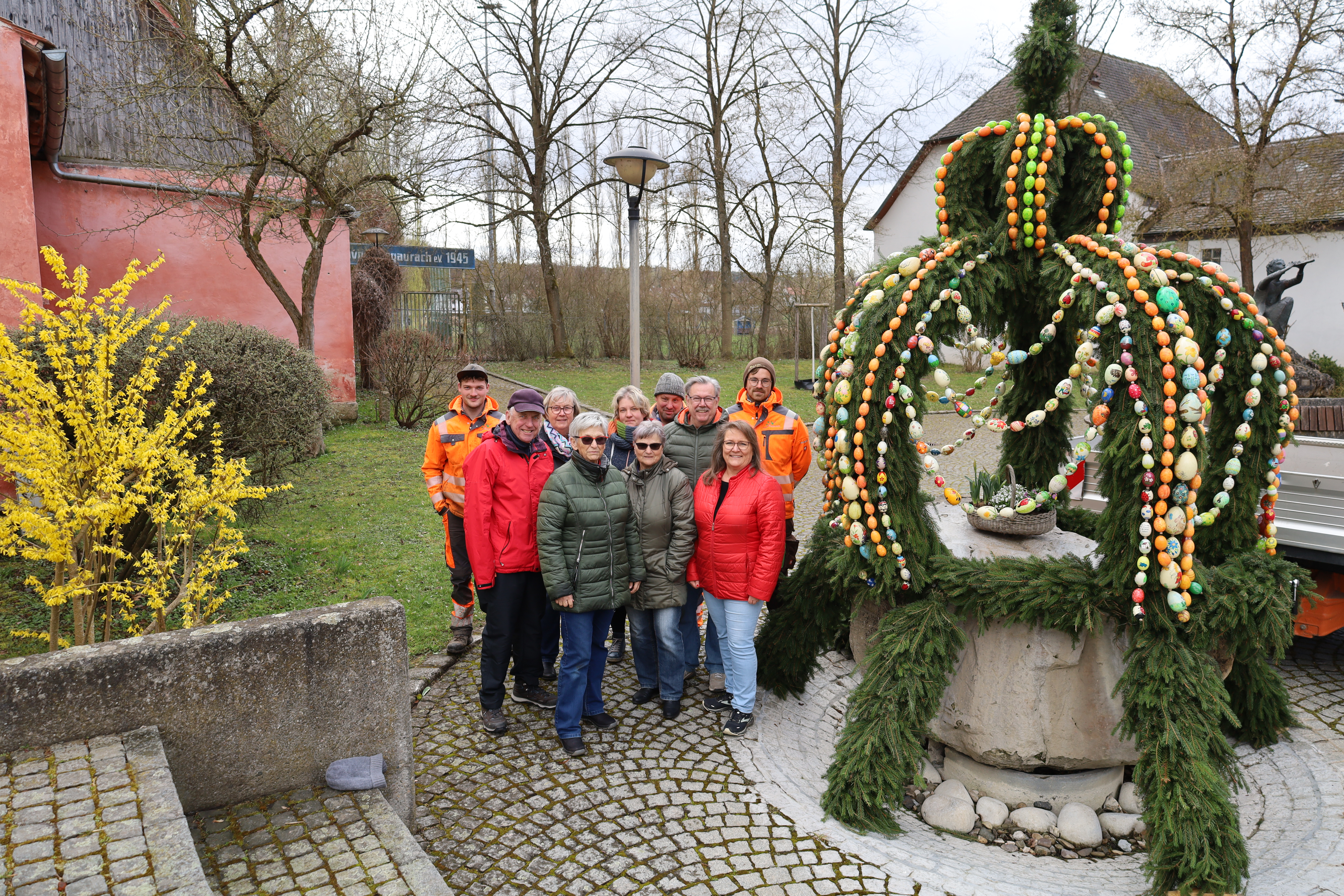 Herzlicher Dank geht auch 2026 wieder an alle Ehrenamtlichen, die die Osterbrunnen in der Gemeinde Stegaurach wieder so wunderschön geschmückt haben. Bunte Eier an den Brunnen finden Sie bei einem österlichen Ausflug durch die Gemeindeteile in Höfen, Waizendorf, Unteraurach und Stegaurach. In Kreuzschuh wurde in diesem Jahr wieder eine Osterkrone aufwändig gebunden. In Stegaurach auf dem Luigi-Padovese-Platz haben die Landfrauen wieder eine besonders große Osterkrone mit bunten, selbstgemalten Eiern angebracht (Foto oben). Die Mitarbeiter des Bauhofes waren gerne beim Aufstellen behilflich. Wer Lust hat, die Osterbrunnen-Teams zu verstärken, möchte sich gerne melden! Verstärkung wird ständig gesucht, damit diese schöne Tradition weiterleben kann.