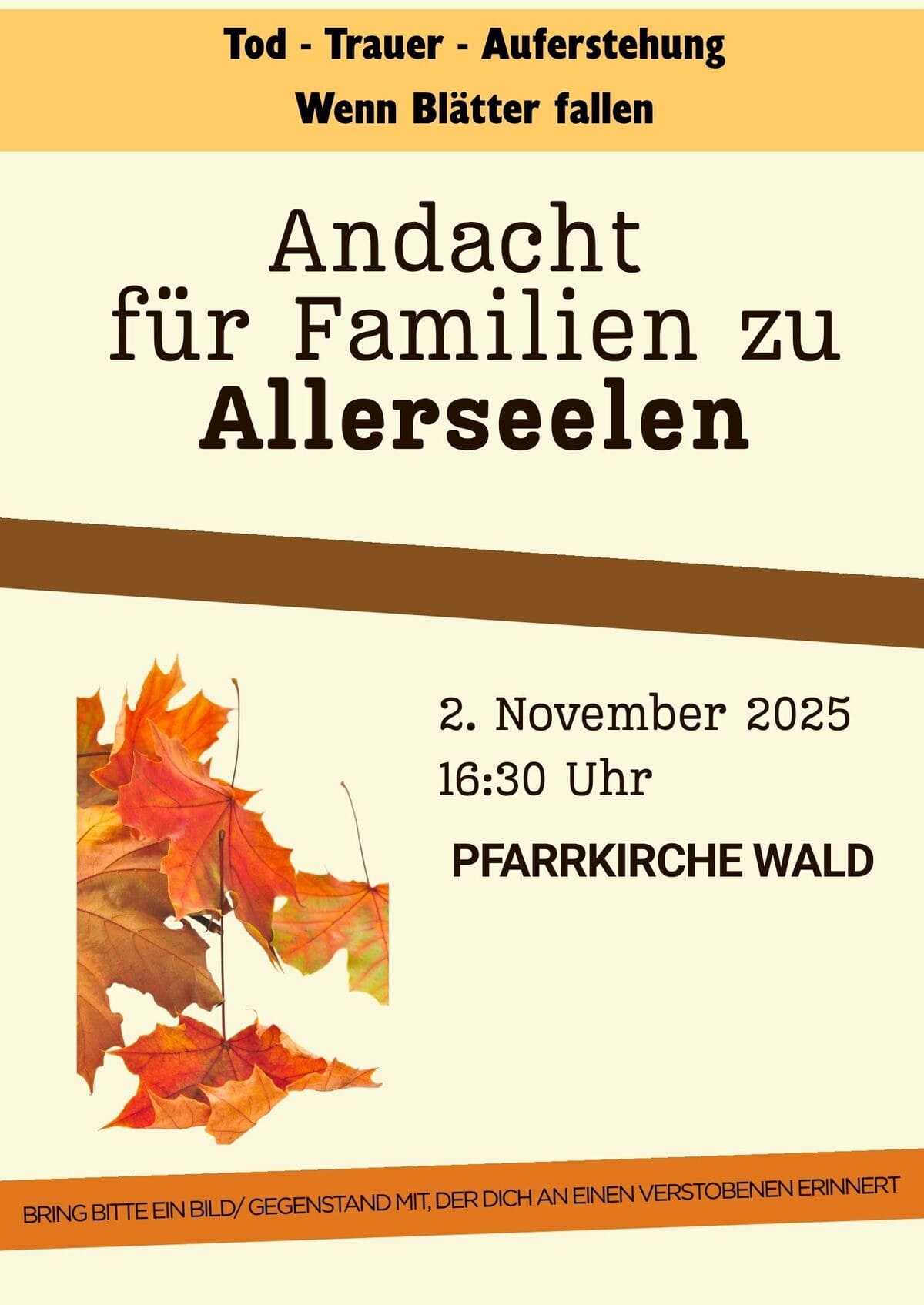 Am Sonntag, den 2. November 2025 findet um 16:30 Uhr in der Pfarrkirche Wald eine Andacht für Familien zu Allerseelen statt.