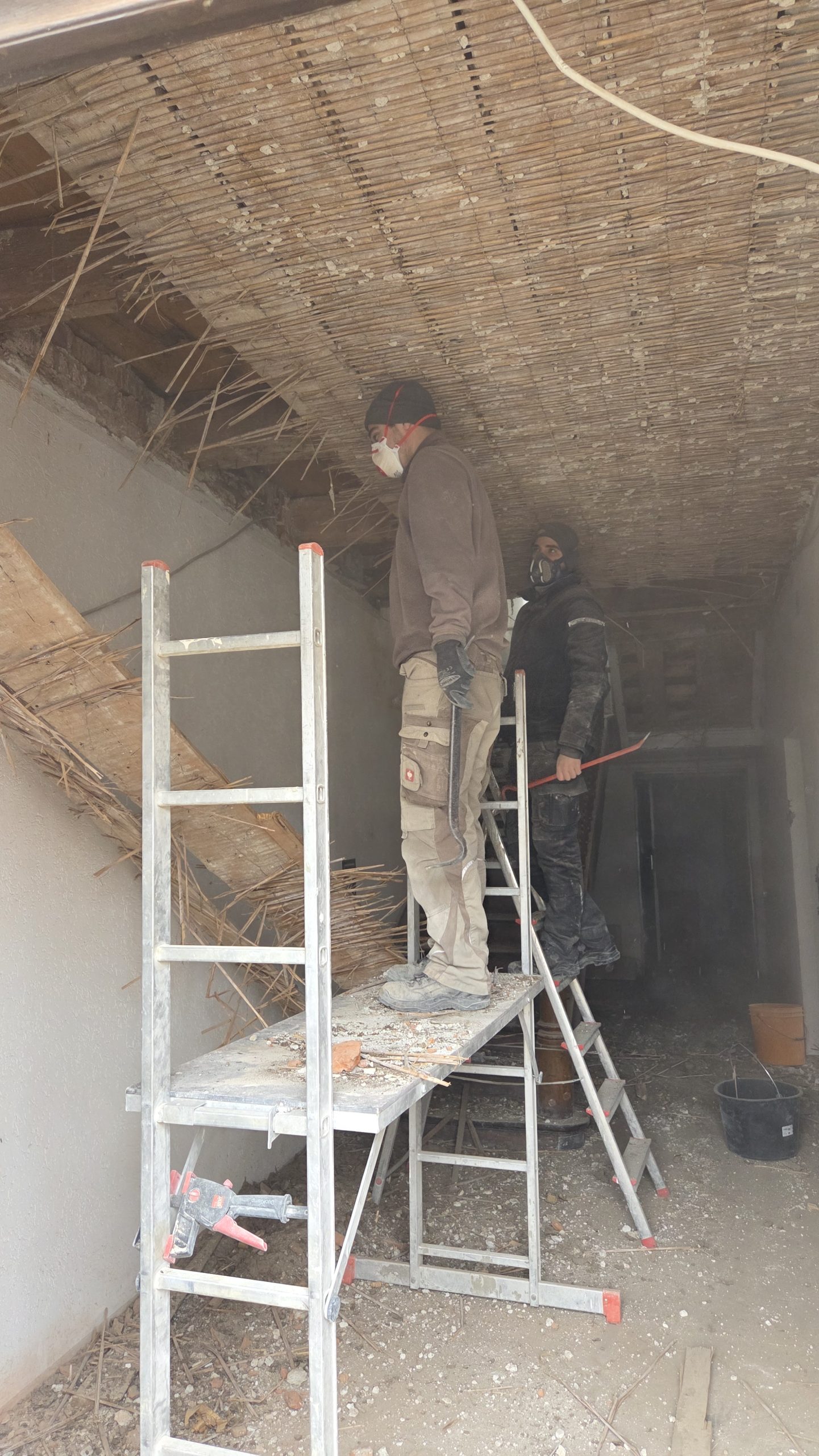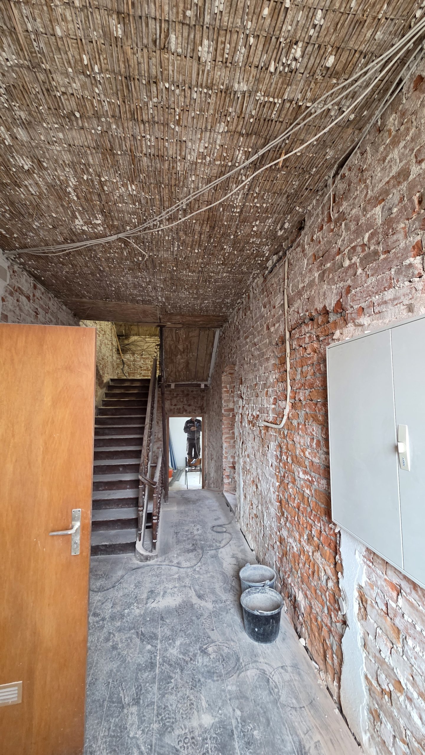 Die Abbrucharbeiten schreiten weiter voran. Schon über 300 Stunden wurden in Eigenleistung erbracht um das Haus zu entkernen! Der Putz wurde in mühsamer Handarbeit von den Decken und Wänden gestemmt und unzählige Eimer voll Schutt wurden in die Container getragen!