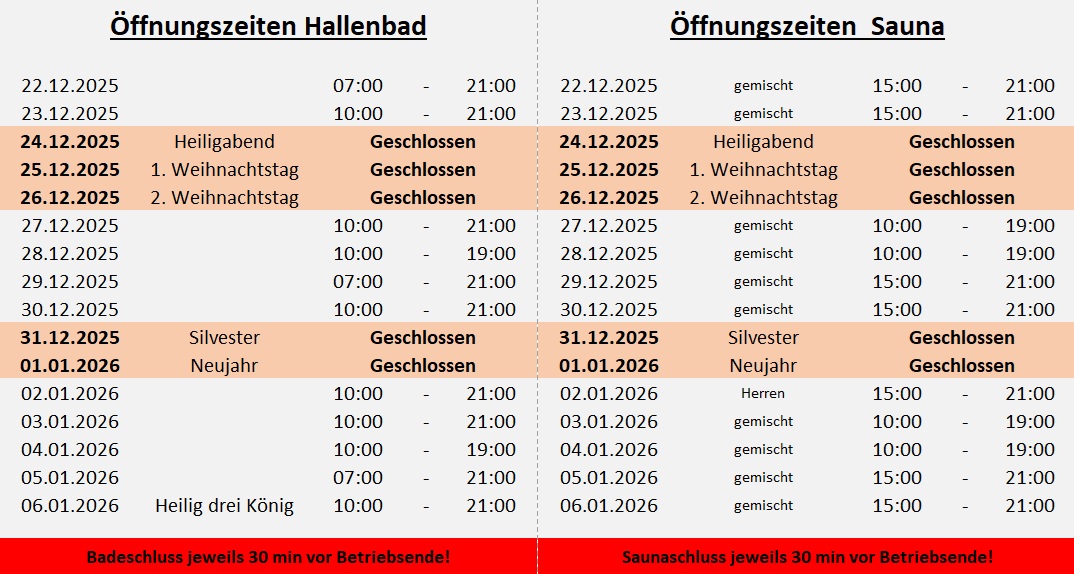 Öffnungszeiten von Hallenbad und Sauna zu Weihnachten