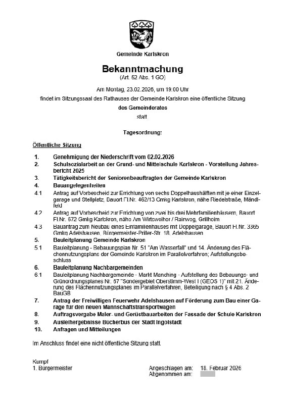 Heute Abend findet um 19 Uhr eine öffentliche Gemeinderatssitzung im Sitzungssaal des Rathauses statt. Öffentlich behandelt werden 10 Tagesordnungspunkte. Anschließend stehen 5 nichtöffentliche Tagesordnungspunkte auf der Einladung.