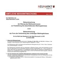 Der Sitzung des Wahlausschusses zur Feststellung des abschließenden Wahlergebnisses sowie Bekanntmachung der Form der Verkündung des vorläufigen Wahlergebnisses für die Wahl des Stadtrats in der Stadt Neumarkt i.d.OPf. am 08.03.2026Hier erhalten Sie die amtlichen Bekanntmachungen der großen Kreisstadt Neumarkt i.d.OPf.