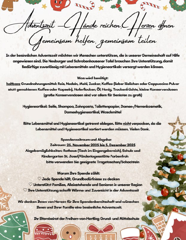 In dieser warmen, lichtvollen Zeit möchten wir gemeinsam ein Zeichen der NĂ€chstenliebe setzen. Die Tafel Neuburg & Schrobenhausen sammelt haltbare Lebensmittel und Hygieneartikel, unterstĂŒtzt vom Elternbeirat der Freiherr-von-Hertling Schule â und wir laden herzlich zum Mitmachen ein.