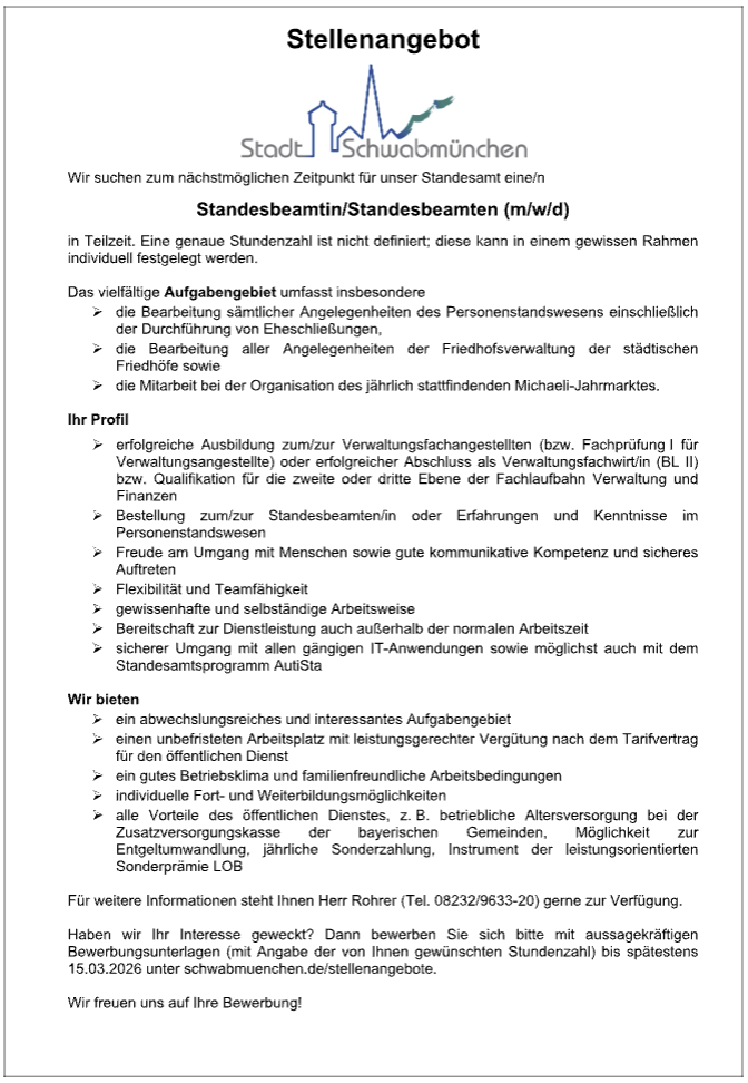 Herzlich Willkommen auf der offiziellen Seite unserer Stadt Schwabmünchen. Hier finden Sie alle aktuellen Informationen rund um das Rathaus, behördliche Themen und das Gemeindeleben. Viel Spaß beim Erkunden der App!