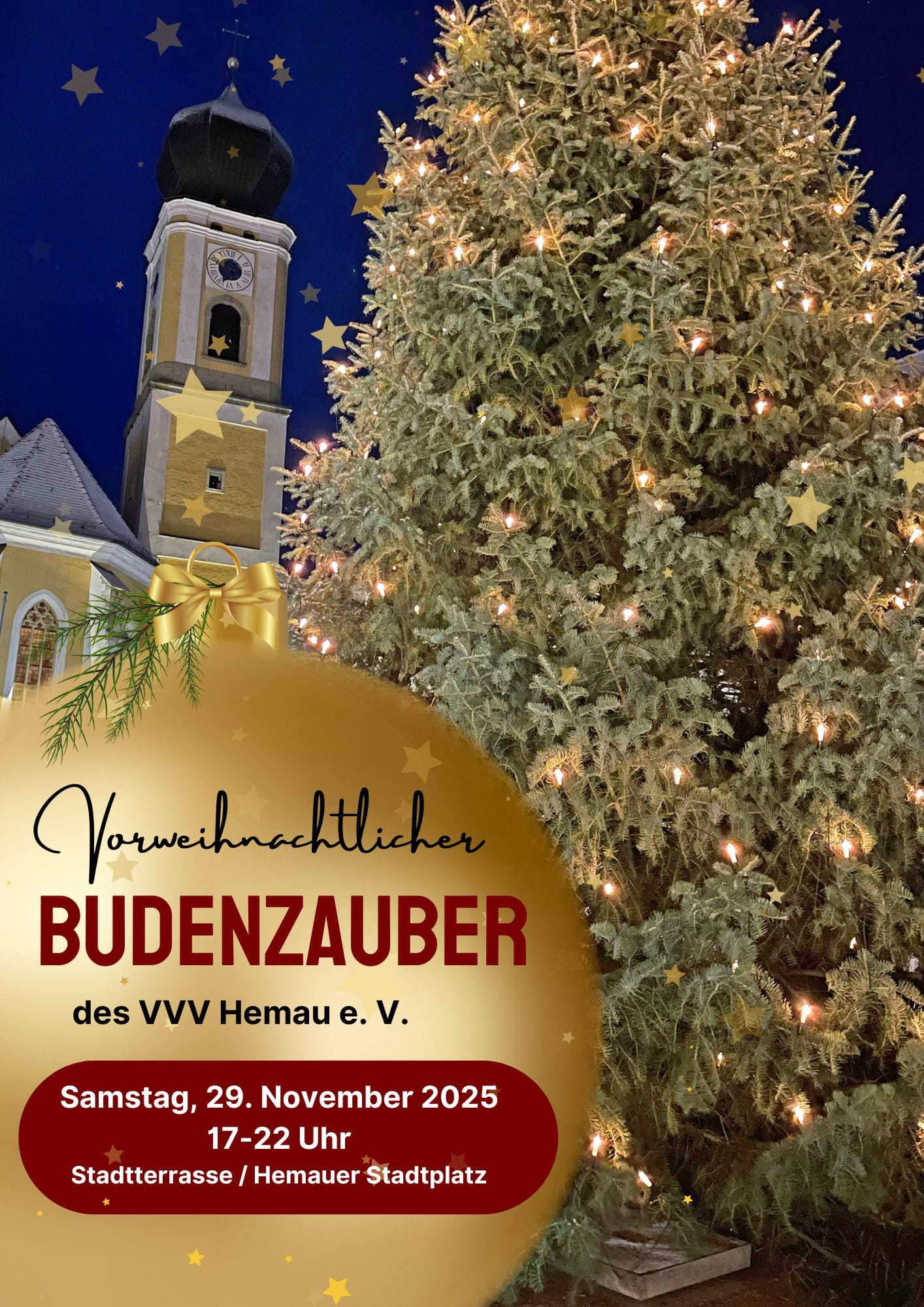 Am heutigen Samstag, den 29. November 2025 ladet der VVV Hemau e. V. von 17-21 Uhr auf der Stadtterasse des Hemauer Stadtplatzes zur Einstimmung auf die Weihnachtszeit ein. Für das leibliche Wohl ist gesorgt mit Glühwein für Groß + Klein, Knacker- und Grillkäsesemmeln.