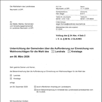 Unterrichtung der Gemeinden über die Aufforderung zur Einreichung von Wahlvorschlägen für die Wahl des Landrats und des KreistagsHier erhalten Sie die amtlichen Bekanntmachungen der großen Kreisstadt Neumarkt i.d.OPf.