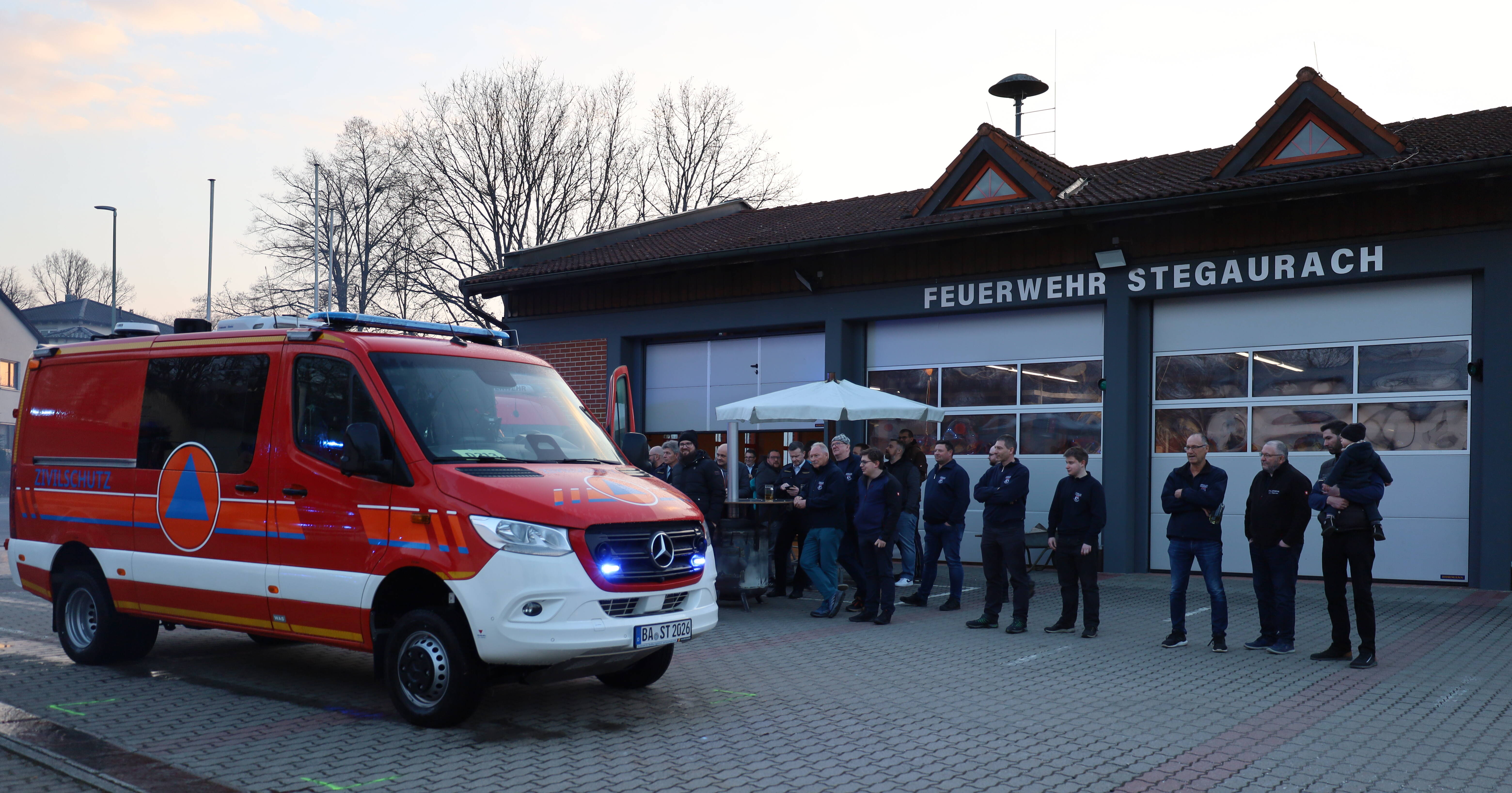 Durch zweiseitig aufgebaute Wassernebelfontänen und unter großem Applaus der Feuerwehrkameraden aus der ganzen Gemeinde Stegaurach sowie der Feuerwehrführung aus dem Landkreis Bamberg und Ehrengästen vom Bundesamt für Bevölkerungsschutz und Katastrophenhilfe fuhr das 450.000 Euro teure Fahrzeug mit Blaulicht auf den Hof der Feuerwehr Stegaurach ein. Bürgermeister Thilo Wagner zeigte sich stolz und freute sich, dass sich die Gemeinde Stegaurach mit dem Stellplatz für das Fahrzeug und mit der Manpower von der FFW Stegaurach ebenfalls beteiligen kann. Landrat Johann Kalb beglückwünschte die Gemeinde und die Feuerwehr Stegaurach zu dem neuen Hightech-Wagen und bedankte sich bei den Feuerwehrkameraden, die sich extra für den Einsatz mit dem CBRN-Erkunder schulen haben lassen. Eine offizielle Einweihung des Feuerwehrfahrzeuges ist für Oktober geplant.